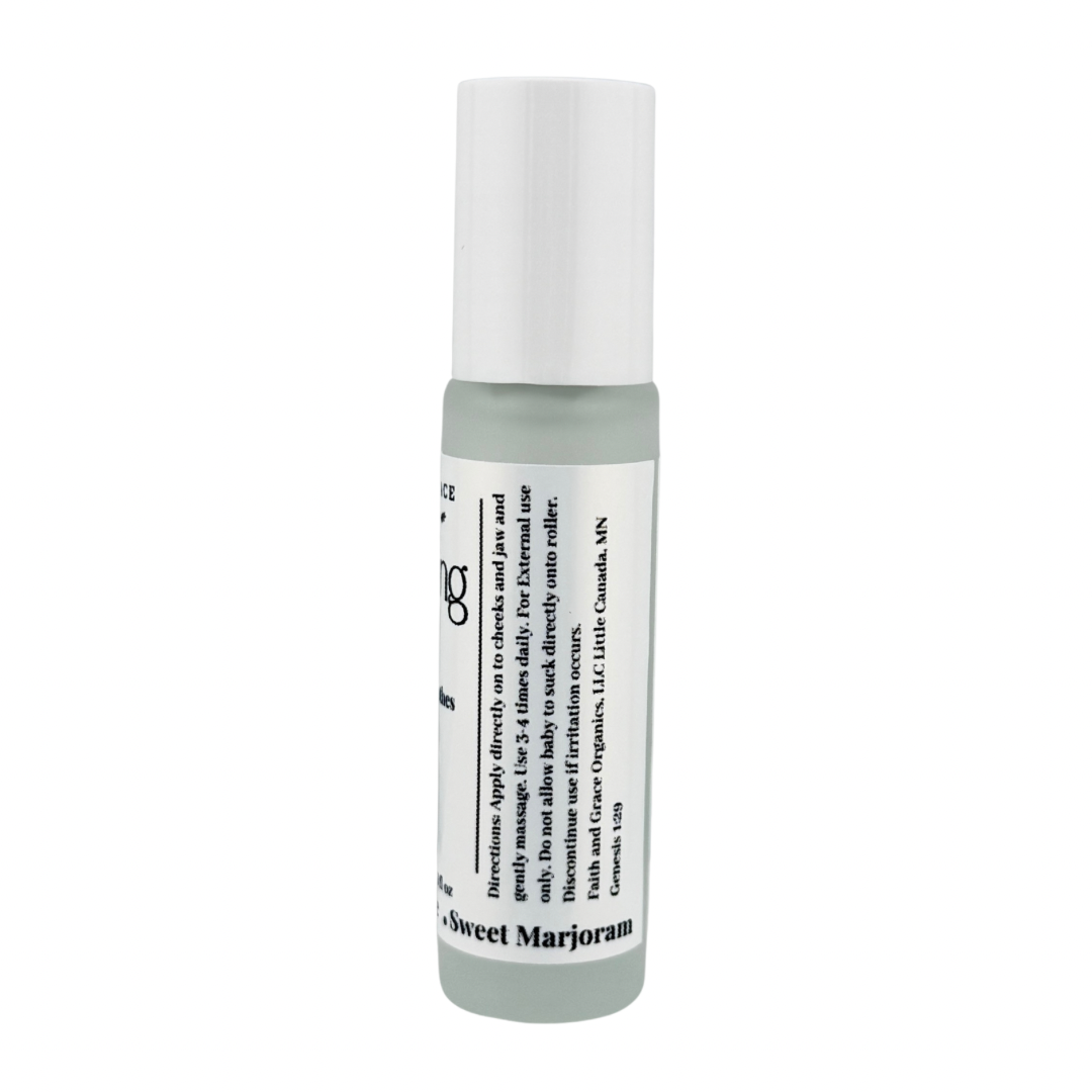 Soothe and nurture your little one with our gentle, organic Teething Oil — a calming blend crafted with fractionated coconut oil, copaiba balsam, Roman chamomile, and sweet marjoram essential oils. Each ingredient was carefully chosen for its naturally relaxing and comforting properties, helping bring peace to both baby and parent during teething phases.